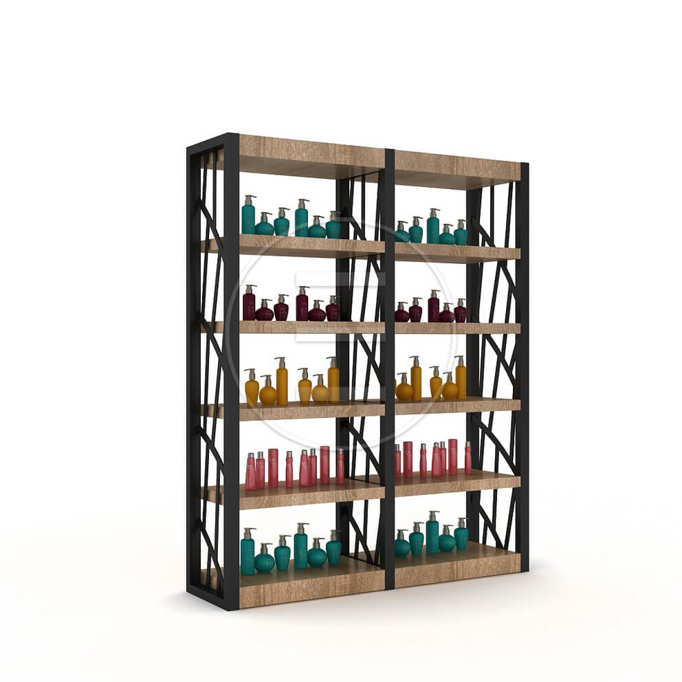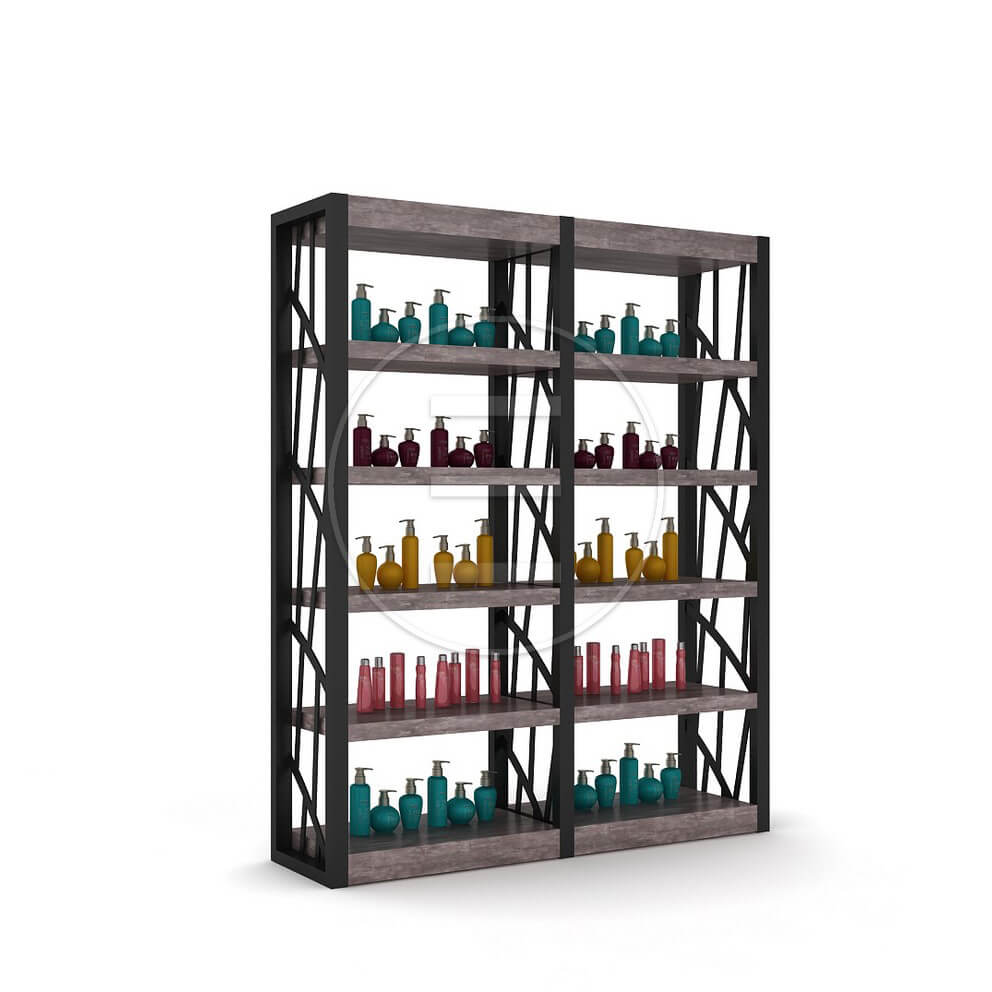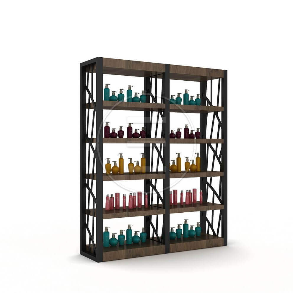 Komoda je opremljena funkcionalnim drvenim policama koje omogućuju uredno izlaganje proizvoda, dekoracija ili profesionalne opreme.