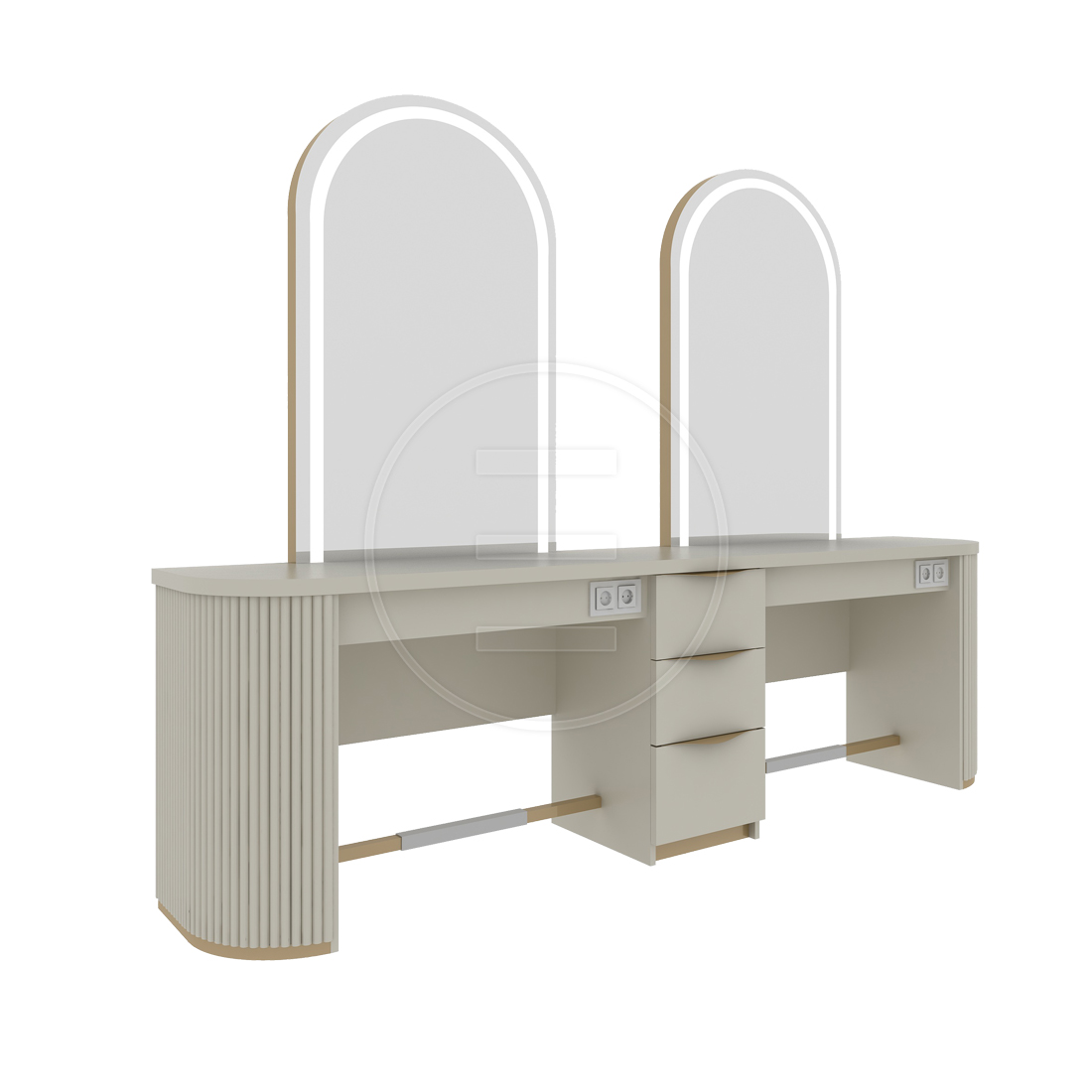 Melina Double je moderna frizerska radna jedinica širine 250 cm, dizajnirana za profesionalne salone koji žele spojiti estetiku, funkcionalnost i vrhunsku rasvjetu. Pjeskareno LED osvjetljenje integrirano u ogledala pruža ravnomjernu iluminaciju bez odsjaja, dok MDF konstrukcija, WES drveni profil i inox detalji osiguravaju stabilnost i dugotrajnost.