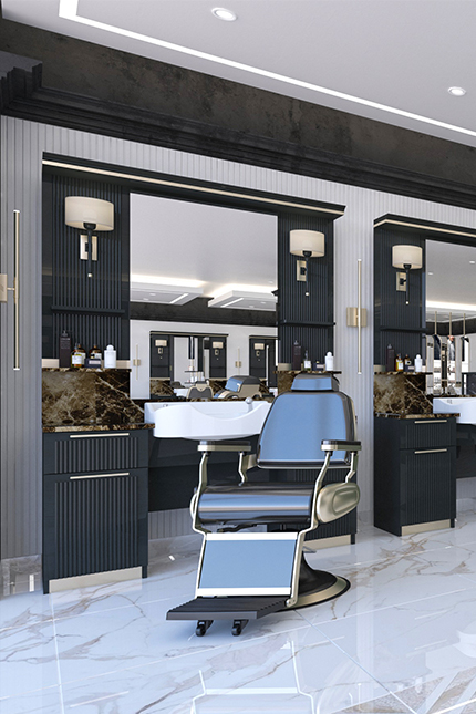 Kombinacija crnog membrane dekora i elegantnih zlatnih inox detalja čini Chaplin idealnim izborom za premium barber shopove i moderne frizerske salone.