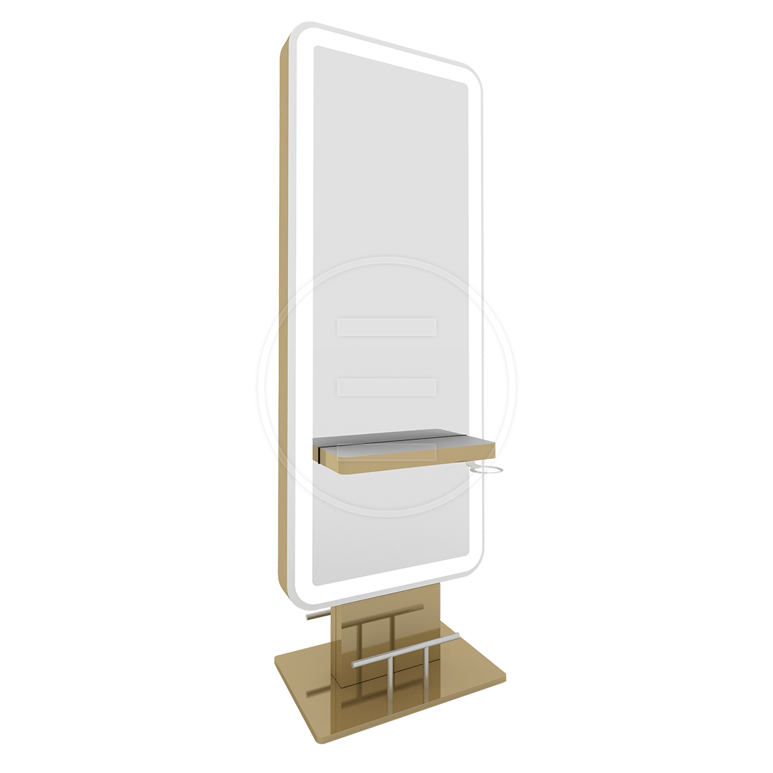 Softy Island styling jedinica utjelovljuje sofisticiranu eleganciju i funkcionalnost u jednom dizajnerskom rješenju. S velikim CNC rezanim Flotal ogledalom, zlatnim rubovima i inox detaljima, ova radna jedinica omogućuje istovremeni rad dva stručnjaka uz maksimalnu profesionalnost i estetski dojam.