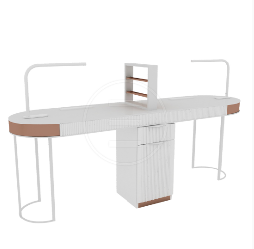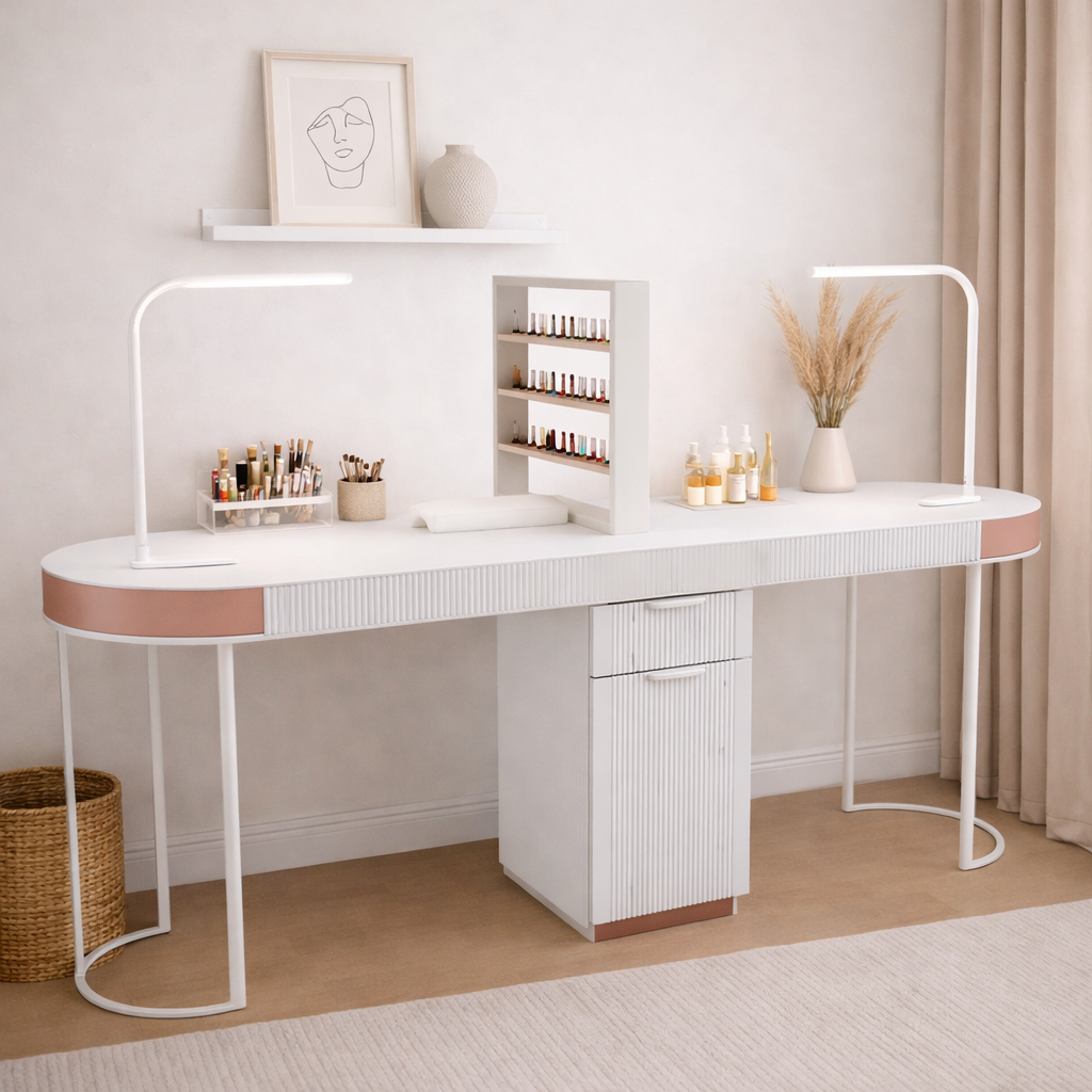 ROZA Double Nail Station je elegantan i funkcionalan dvostruki stol za manikuru, dizajniran za profesionalnu upotrebu u nail i kozmetičkim salonima. Dolazi s dvostrukom radnom stanicom i time omogućuje dvije manikure u isto vrijeme. Elegantnog dizajna i stabilne konstrukcije, pruža funkcionalan i uredan radni prostor. Opremljen je policama za pohranu nail alata, lakova i pribora i LED rasvjetom. Također, ima mogućnost ugradnje vakuumskog sustava.