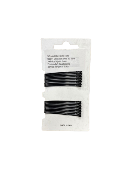 Klasične crne ukosnice u pakiranju od 20 komada idealne su za svakodnevno oblikovanje frizura i profesionalnu frizersku upotrebu. Izrađene od kvalitetnog metala, osiguravaju čvrsto držanje kose bez klizanja. Prikladne su za sve tipove kose i različite stilove frizura. Proizvedeno u Italiji.